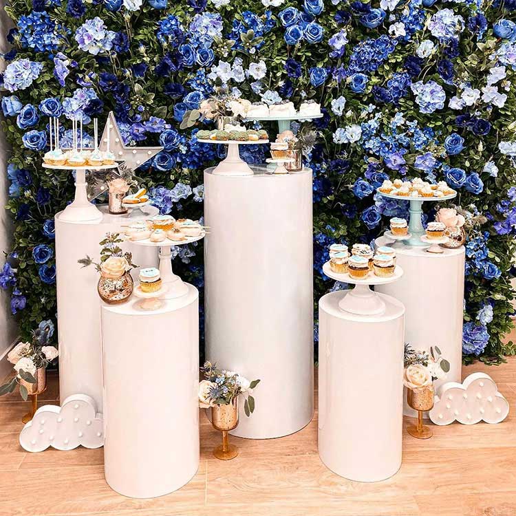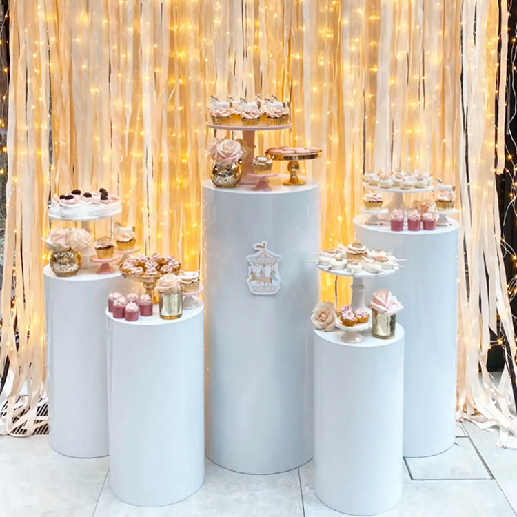 Το τραπέζι γλυκού με κυλινδρική βάση χρησιμεύει και ως δοχείο και ως στολίδι. Συνήθως, έρχονται σε διάφορους συνδυασμούς: συνδυασμοί 3 τεμαχίων, συνδυασμοί 5 τεμαχίων, συνδυασμοί 7 τεμαχίων κ.λπ. Ο πιο συνηθισμένος συνδυασμός είναι πέντε κομμάτια. Ανεξάρτητοι κυλινδρικοί σωλήνες διαφόρων μεγεθών μπορούν να τοποθετηθούν με ευελιξία και αποτελούν σημαντικό μέρος της σκηνής. Ταυτόχρονα, προσφέρουμε επίσης προσαρμογή για το μέγεθος και το σχήμα. Επιπλέον, ταιριάζουν με τη διακόσμηση του πάρτι σας.