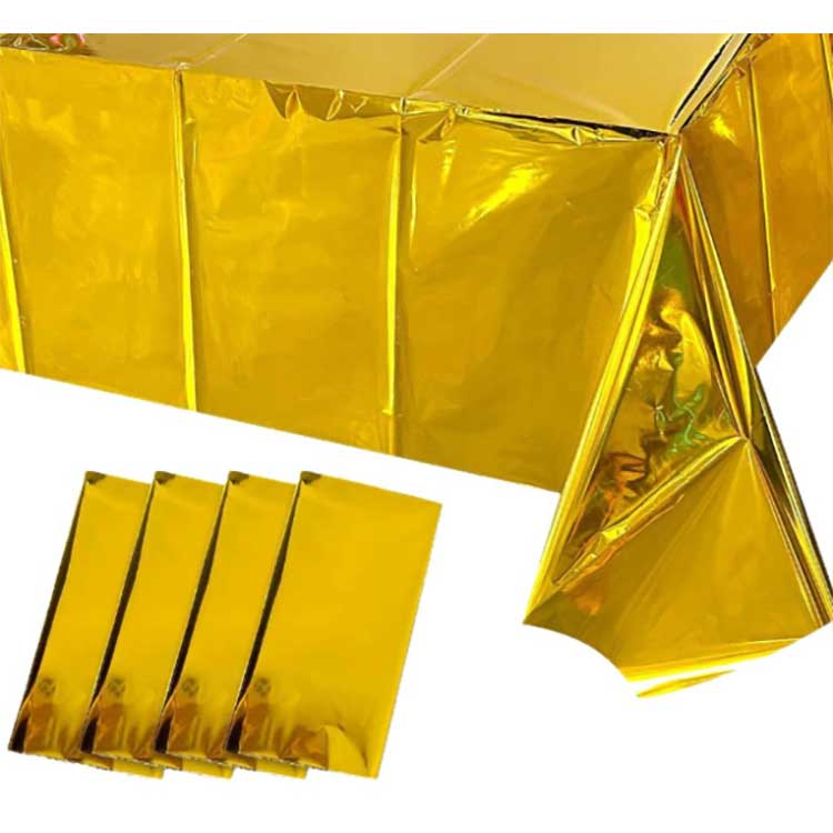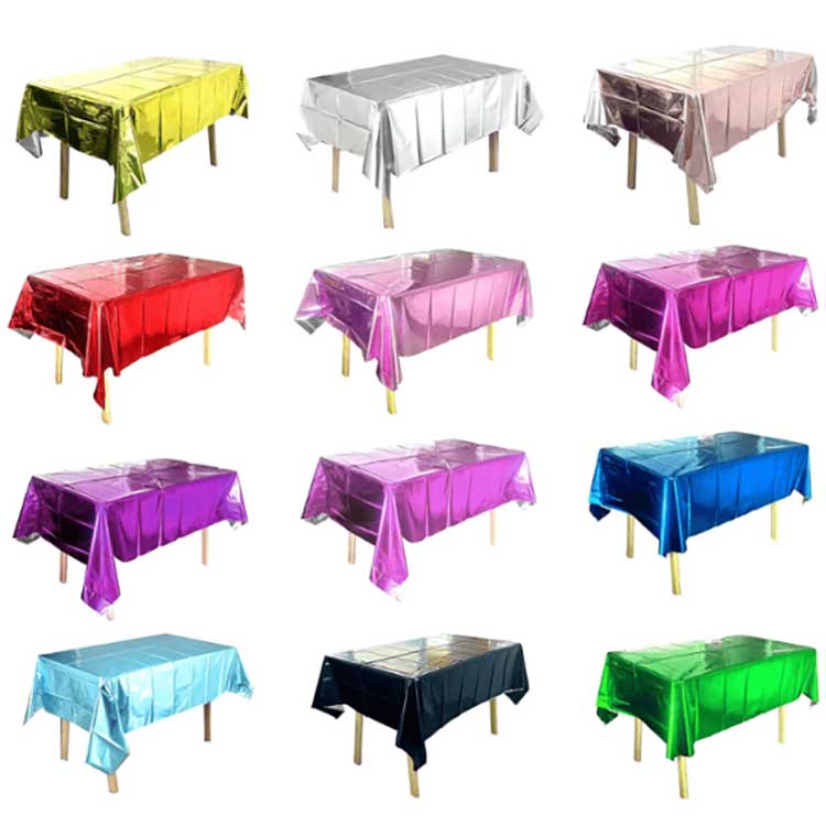 Κάλυμμα τραπεζιού με φύλλο αλουμινίου χρησιμοποιείται για στήσιμο τραπεζιού σε διάφορες γιορτές. Μπορεί να αποτρέψει την επιφάνεια του τραπεζιού από λεκέδες, γρατσουνιές ή ζημιές και τα χρώματα και τα σχέδια μπορούν επίσης να φέρουν διακοσμητικά εφέ. Είναι κατασκευασμένο από ειδική μεμβράνη PET επικαλυμμένη με αλουμίνιο. Κατά τη διαδικασία κατασκευής, χρησιμοποιήσαμε την τεχνολογία επίστρωσης κενού για να εξασφαλίσουμε την αντοχή, την ανθεκτικότητα και την αντιγηραντική απόδοση του καλύμματος τραπεζιού. Επιπλέον, τα υψηλής πυκνότητας μόριά του μπορούν να αποτρέψουν αποτελεσματικά τη διείσδυση λεκέδων από σούπα ή λάδι και έχει επίσης αδιάβροχη λειτουργία.